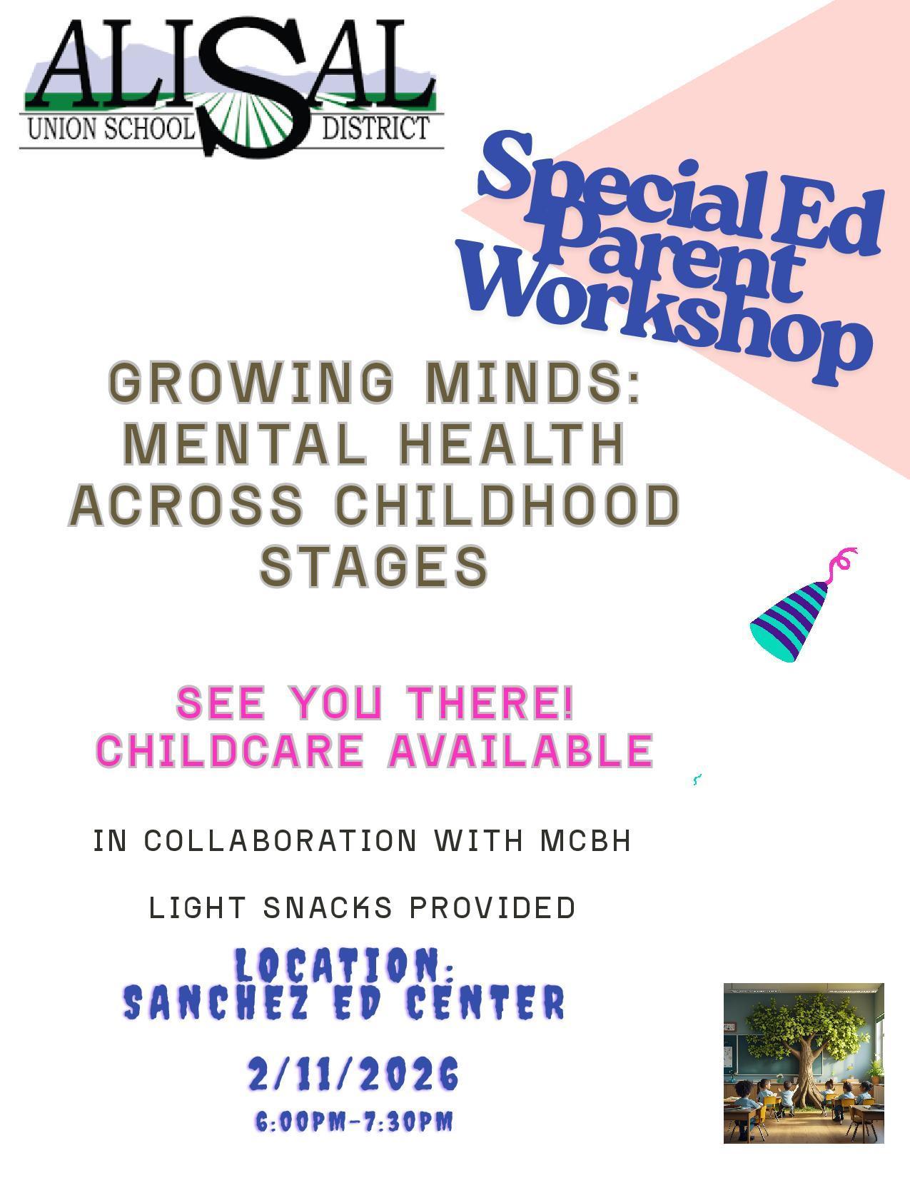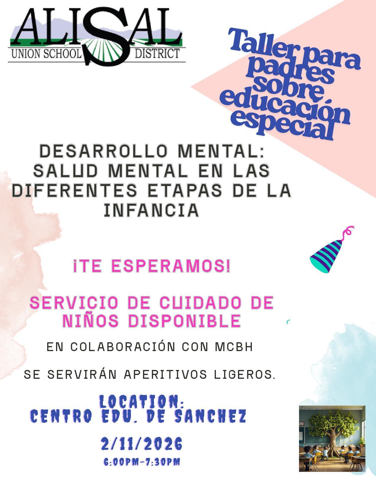 El Departamento de Educación Especial ofrecerá un taller para padres sobre salud mental en niños en sus diferentes etapas de desarrollo. Las necesidades de salud mental de su hijo cambian desde la infancia hasta la adolescencia. Este taller le ayudará a comprender las etapas emocionales y los desafíos propios de cada una. El objetivo es sentar las bases para un futuro sólido y resiliente.